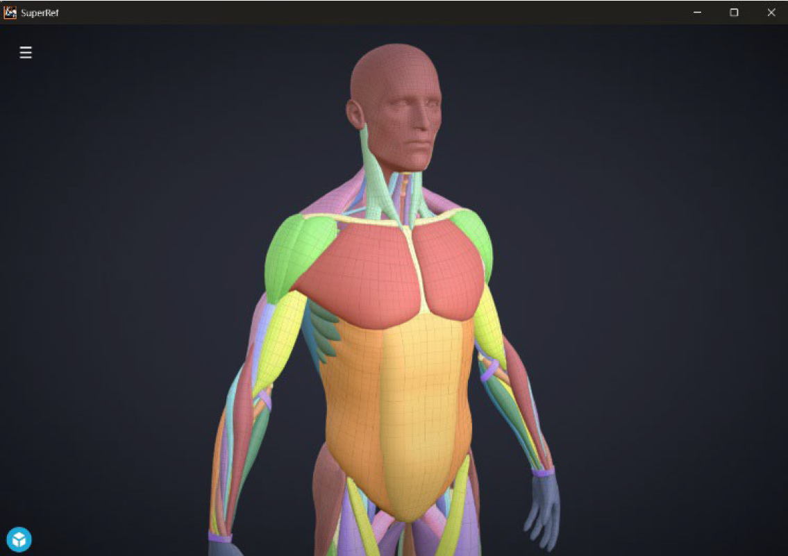 An interactive écorché targeted towards character artists on digital platforms. Built using JavaScript and Electron.js, SketchFab’s API, this app serves as visual reference for artists with full 3D controls as well as annotations for detailed anatomy.